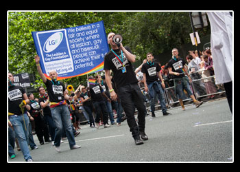 As part of my work with the Lesbian and Gay Foundation in Manchester I was part of the march going through the city streets. The person at the front did a brilliant job of keeping the marchers energised. I think this shows him leading the group well. |